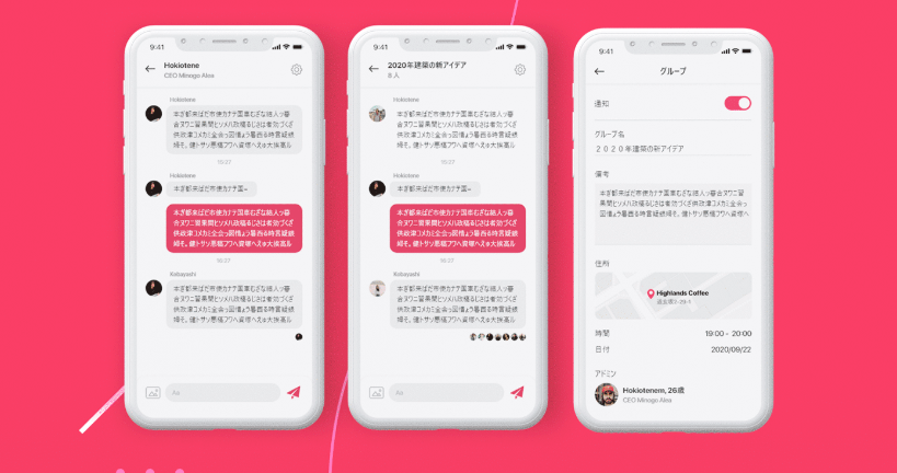 The application combines user discovery, profile presentation, messaging, and group search into a single mobile experience, supported by a strong visual identity and intuitive interaction flows.